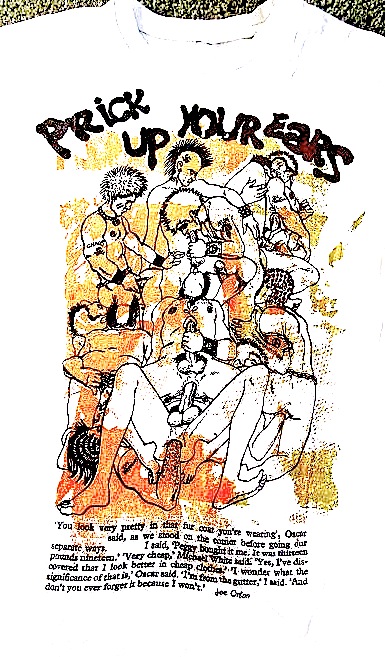 The store’s designs confronted social and sexual taboos, and included T-shirts bearing images of the Cambridge Rapist’s face hood, semi-naked cowboys from a 1969 illustration by the US artist Jim French, a trompe-l’œil image of bare breasts from a novelty shirt first produced by Rhode Island School Of Art students Janusz and Laura Gottwald in the late 1960s, and pornographic texts from the book School for Wives by the beat author Alexander Trocchi. Also featured were T-shirts with the slogan ‘Prick Up Your Ears’, a reference to the biography of influential proto-punk subversive Joe Orton. The T-shirts also featured text culled from the biography of Orton stating how cheap clothes suited him. Among the designs were clear plastic-pocketed jeans, zippered tops and the Anarchy shirt which used stock from the 1960s manufacturer Wemblex. These were bleached and dyed shirts and adorned with silk Karl Marx patches and anarchist slogans.