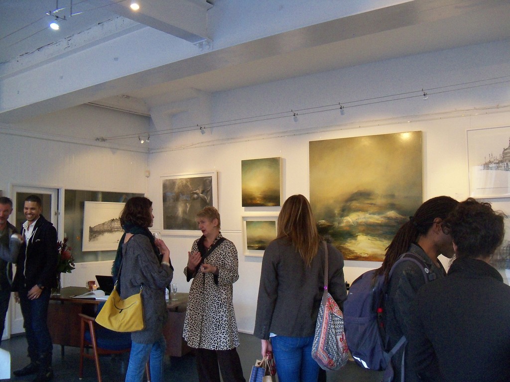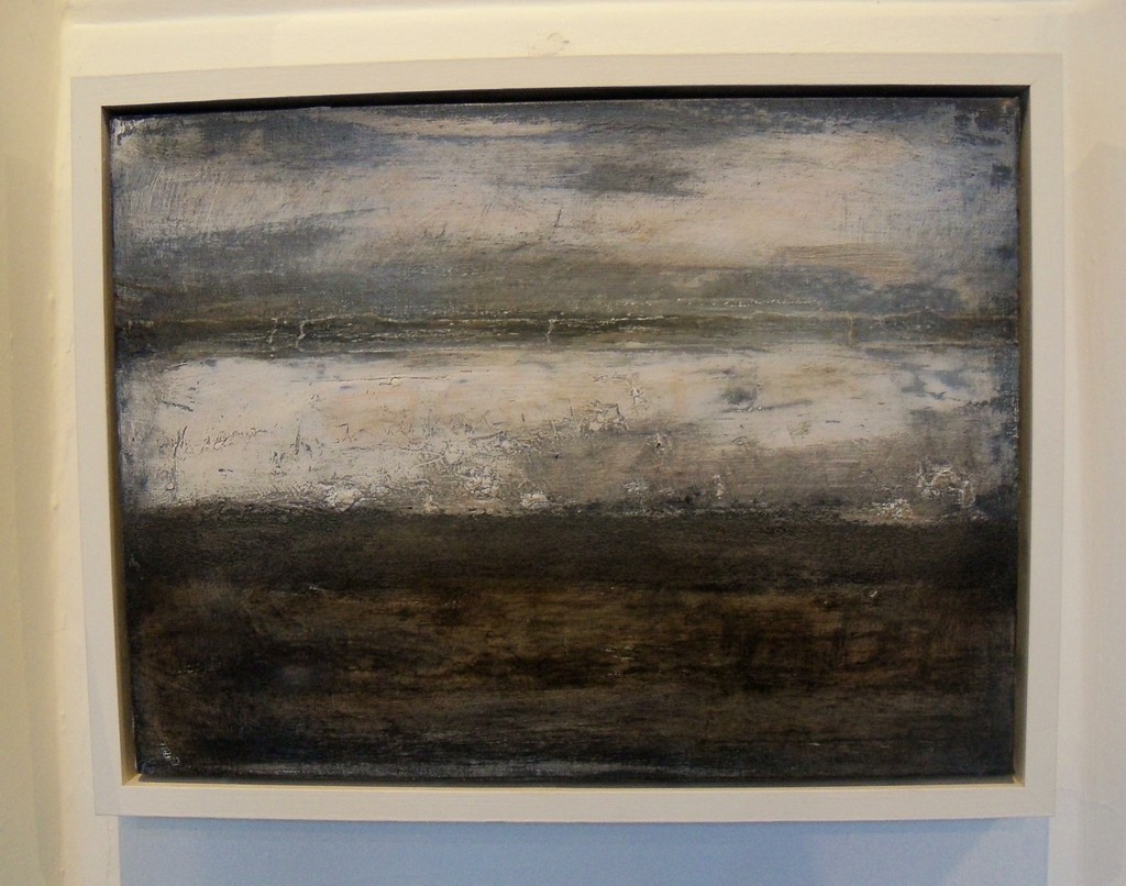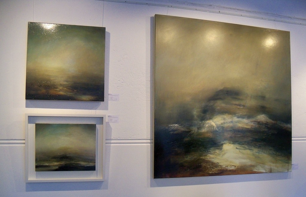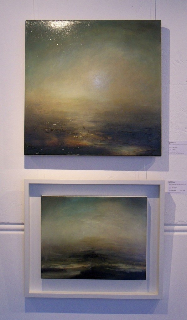 The place is Sussex, and the time is now. This is gallery owner Robin Cameron’s third show in these premises. I might venture that he selects pieces which combine traditional fine art with a contemporary edge. Take Mark Johnston’s large oil painting A Distant Echo, which dominates the gallery. The dark and yellowy tempest is given a luminous quality through layering and glazing, a time consuming traditional oil painting technique. Beneath the murky yellow a bright core shines through. I thought of Turner’s painting of a snow storm, seemingly expressionist in style and centuries ahead of its time, as defined by the conventions of art history. Johnston’s work contains glimpses of Turner’s luminescence, but allows full rein to the modern expressionist impulse.
