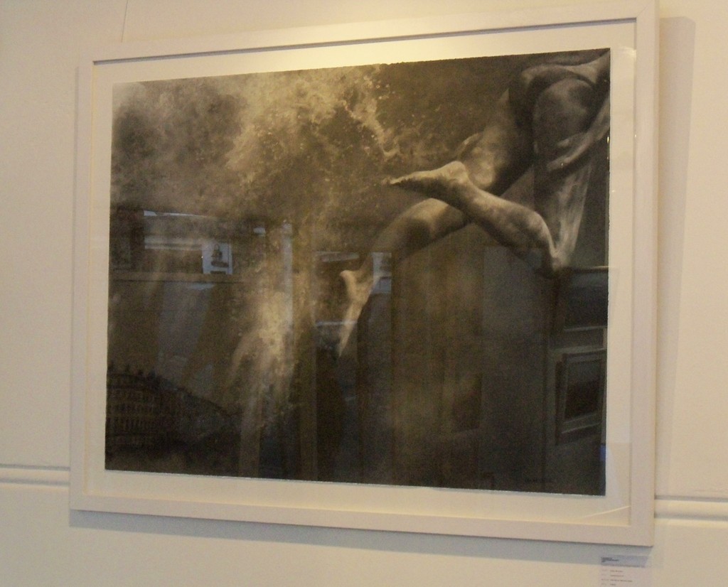 Another piece which caught my eye for its strong sense of atmosphere was Patsy MacArthur’s Heavenbound III. It’s a refined charcoal drawing, on high quality textured Fabriano paper, of a woman in a swimming pool. Thus far, it’s a figure drawing, a genre which got chased out of galleries by modernism in the 1970s, but returned ten years ago as figurative art. What gives it that contemporary edge is the unusual cropping – our view is underwater and we see only a woman’s legs in the pool.
