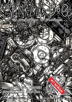 Art Schism is proud to present Stink Like Dog in his second solo exhibition at Art Schism. He has been a friend with the gallery since the very beginning, and became an exhibiting artist after finishing a book he spent 17 years compiling. Stink Like Dog, real name Etienne, specialises in incredibly complex and detailed drawings, using basic materials like pen, ink and tip-ex to create his work.Sometimes political, always impressive, Etienne reveals that his work often takes on “a life of its own”. He said: “I have the key elements worked out and pretty much just make up the rest of it as I go along, which a lot of times reflects my mood/mindset at the time. I find if everything is worked out beforehand then it’s just drawing by numbers with no unexpected surprises.” His artistic influences mainly surround the 2000AD artists of the early 80s and others including Geoff Darrow, Ian Miller and Katsuhiro Otomo. All of which you can see reflected strongly in his pieces.