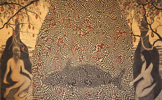 The concept involves turning a gallery space into a ‘Contemporary Cave’ by darkening it and then covering the walls with imagery. He takes inspiration from the surrounding neighbourhood as well as automatic drawings (or scribbles) solicited from the public. The finished piece stands as a reflection of the collective unconscious of that locality.