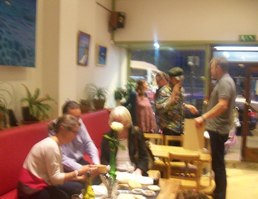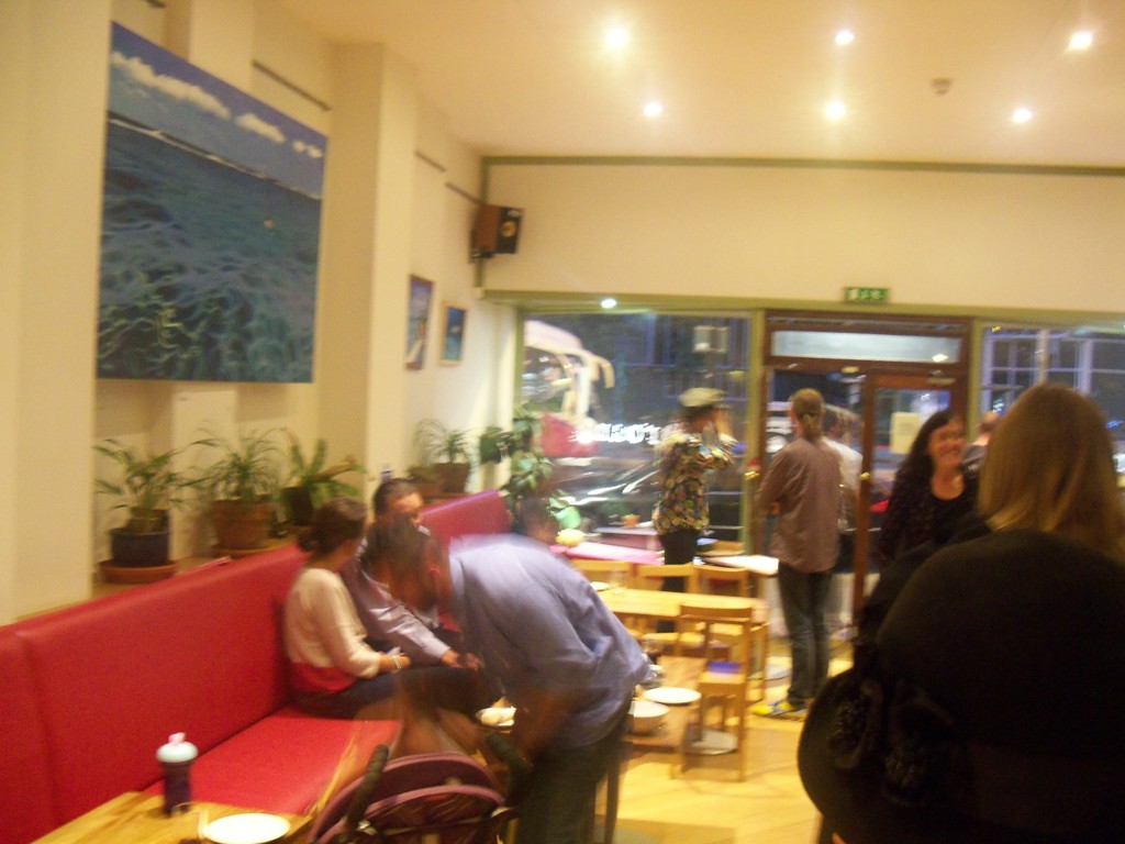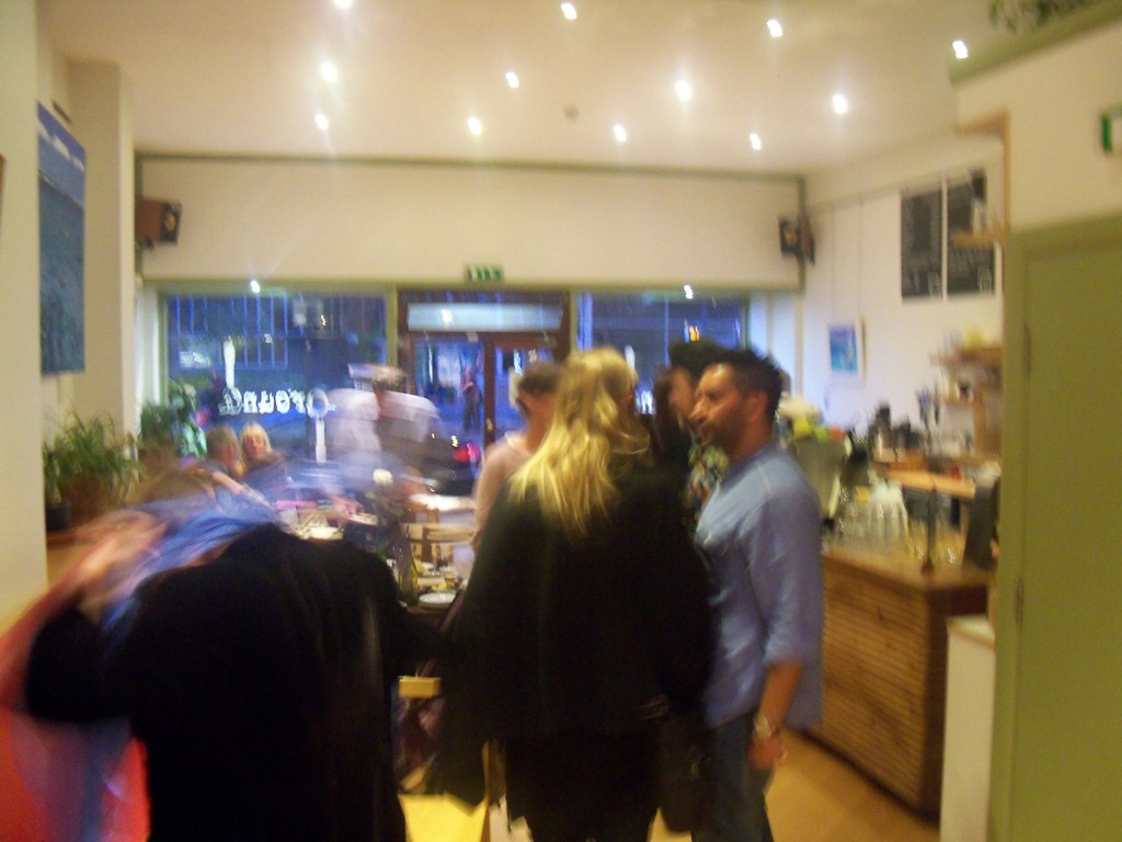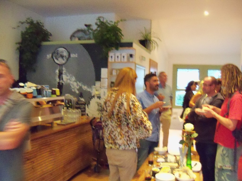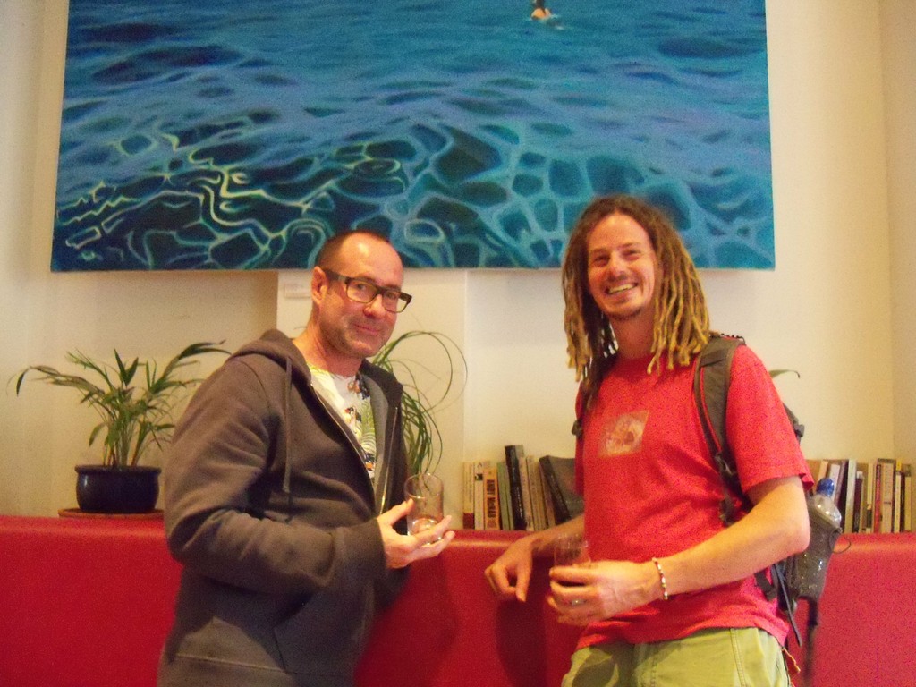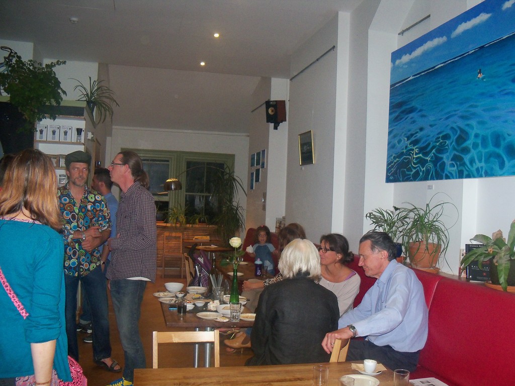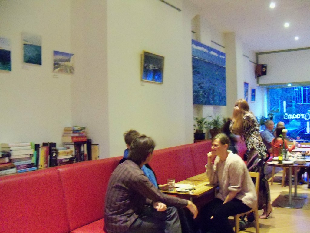 Ground Coffee at Hove got crowded at the private view of Russell Honeyman‘s exhibition of paintings, 12 September 2014. The cafe was a good venue for an art exhibition and guests seemed to enjoy the evening both socially and artistically, being enchanted by Honeyman’s seas and swimmers. Among other guests the show was visited by local artists Judi Thomas, Stuart Graham-Hyde, Alan Ramsay, Jamie McCartney, Amby Kirkpatrick and Antonia Redding as well as some art collectors. Here’s the photo review of the evening.