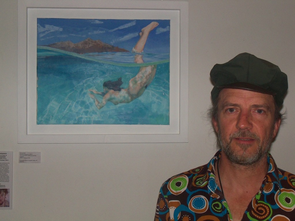 ‘Seas and swimmers’ – mainly acrylic paintings varying in scale from little white cliffs’ impressions to the large ‘Big Swim’ (6 x 4.5 ft) – are focused on one’s body connection with the surrounding environment. Looking at the artwork we experience it in a few dimensions: within a painting as well as artist’s connection to his environment.