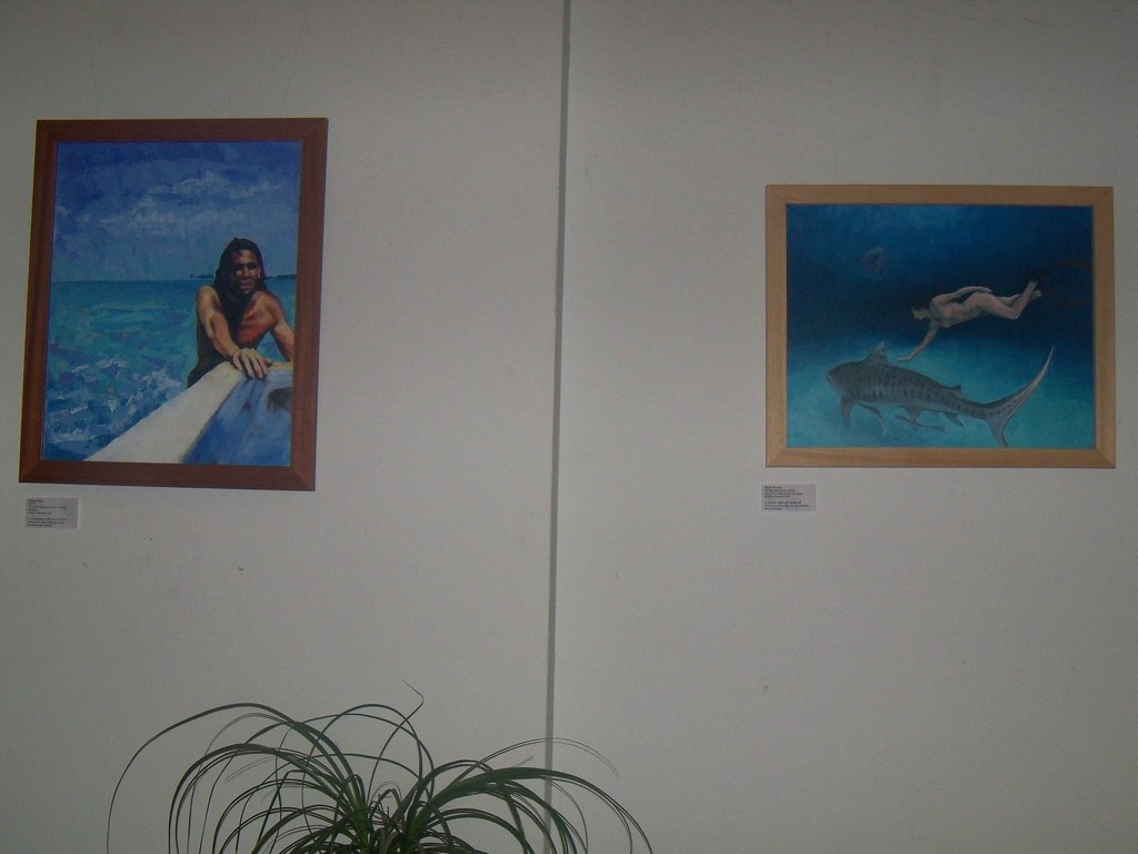 Looking at suspended bodies of divers in ‘Azure Dive’, ‘Shark Diver’, ‘Turquoise Swim’ we feel the sensation of being in water – being carried and touched by water. We experience the play between physicality – sensual touch of water on the body, the body movement and its effort of going through water’s resistance – and ethereality: the body becomes weightless, floating in a space with no gravity. Both are achieved by artist’s sensitivity to colour and light and beautifully expressed in an impressionistic style of painting which enables us to sensually experience the captured moment.