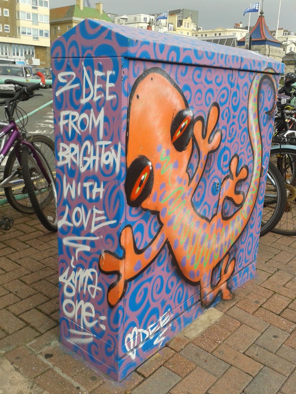 One of Brighton’s prolific graffiti artists, Sinna One, has spray-painted a lovely gecko at the entrance of Brighton Pier. It’s dedicated to Dee, with love from Brighton. Sweet!