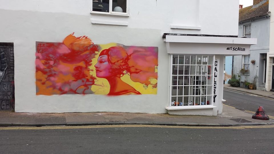 26 March 2015. Wonderful Street Art is being painted on the wall of the Art Schism Gallery in Brighton’s North Laine. Artist known as “Ten of Swords” . The resolution of a difficult situation, faced with truth at last. The colours are a warm harmony of oranges, yellows and reds complemented by pale purple. The mood is enhanced by the face, with its sensation of quiet joy. Lovely.