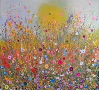 Yvonne’s love of nature and the English countryside deeply influences her work, often painting in the depths of the Devonshire meadows to draw immediate inspiration from the picturesque surroundings. She captures the chaotic yet harmonious energy within nature, whilst bringing warmth and joy to the canvas. Yvonne beautifully unites various materials to create layer upon layer of tactile texture, adding another dimension to her captivating paintings. The glitter, reminiscent of early morning dew, the vibrant colours conjuring the kaleidoscopic palette of the countryside, and the delicate scattering of flowers come together organically in her unique artistic vision.