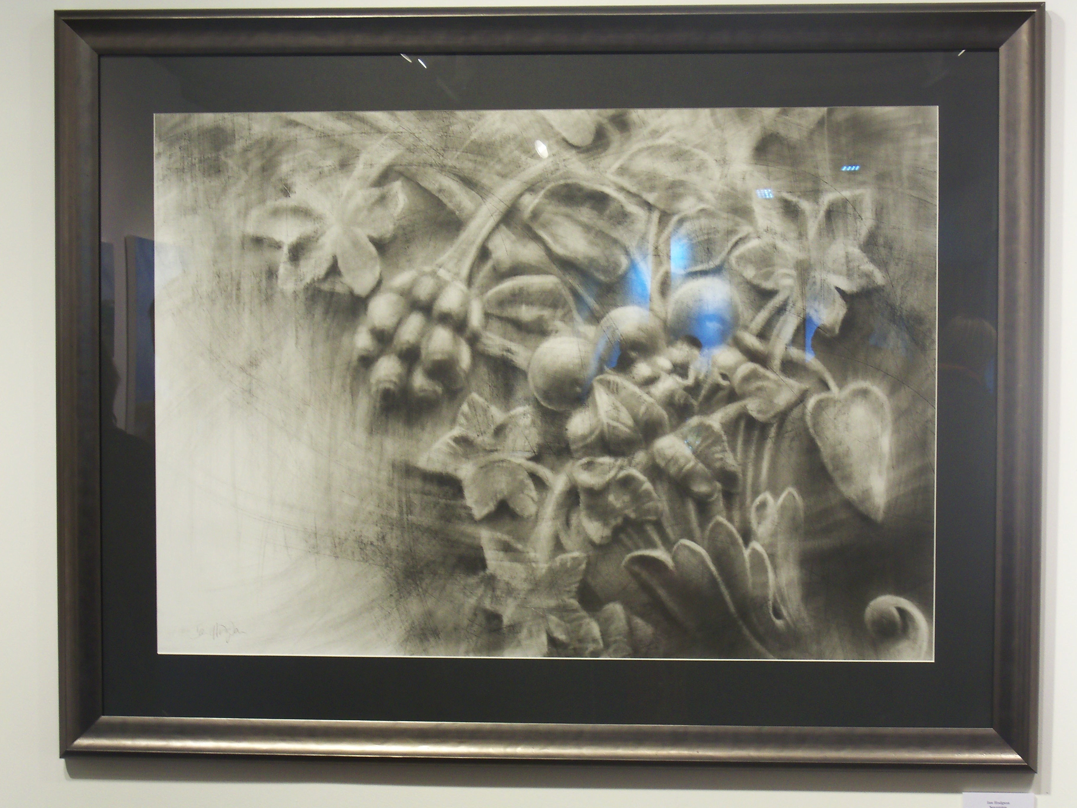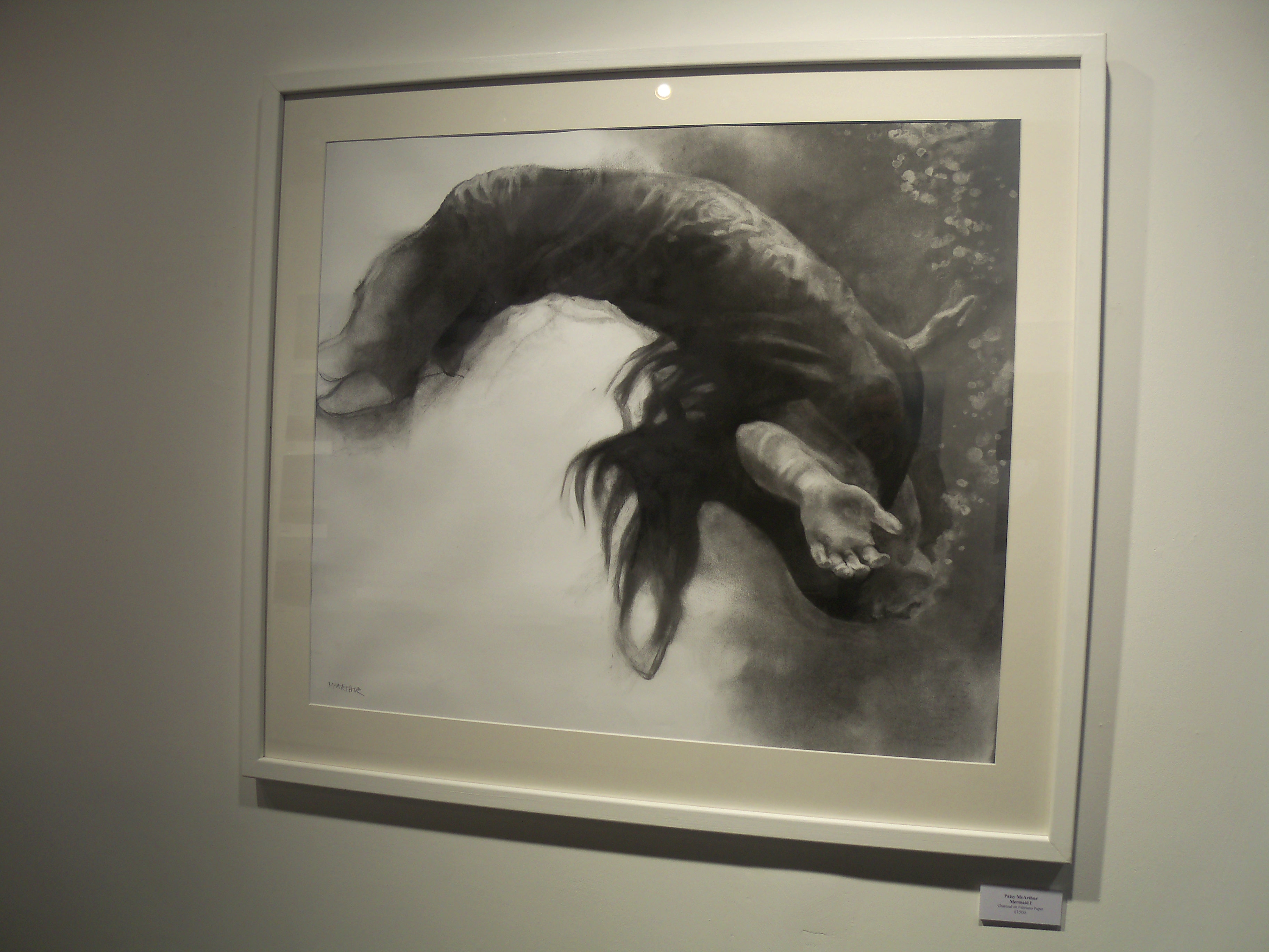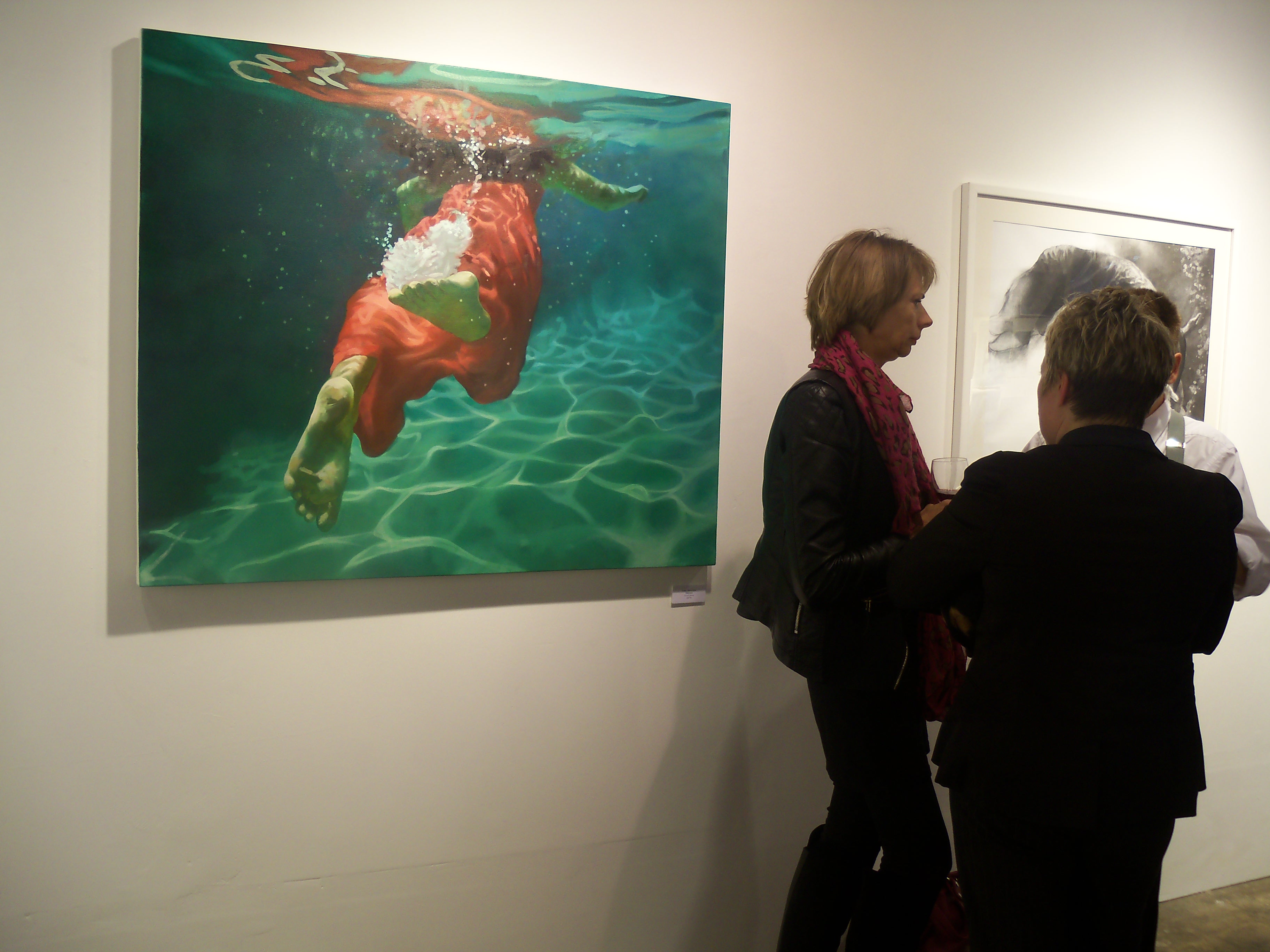 Naked Eye’s airy white showroom was the perfect place for these works. The visitor is greeted by a huge river-green and scarlet composition of a figure floating in water, alongside large charcoal drawings (Patsy McArthur); expressive works in graphite including the iconic drawing of the Brighton Peace statue that graced the cover of this year’s Brighton Artists directory (Ian Hodgson), and atmospheric expressionist-abstract landscapes (Lesley Jones).