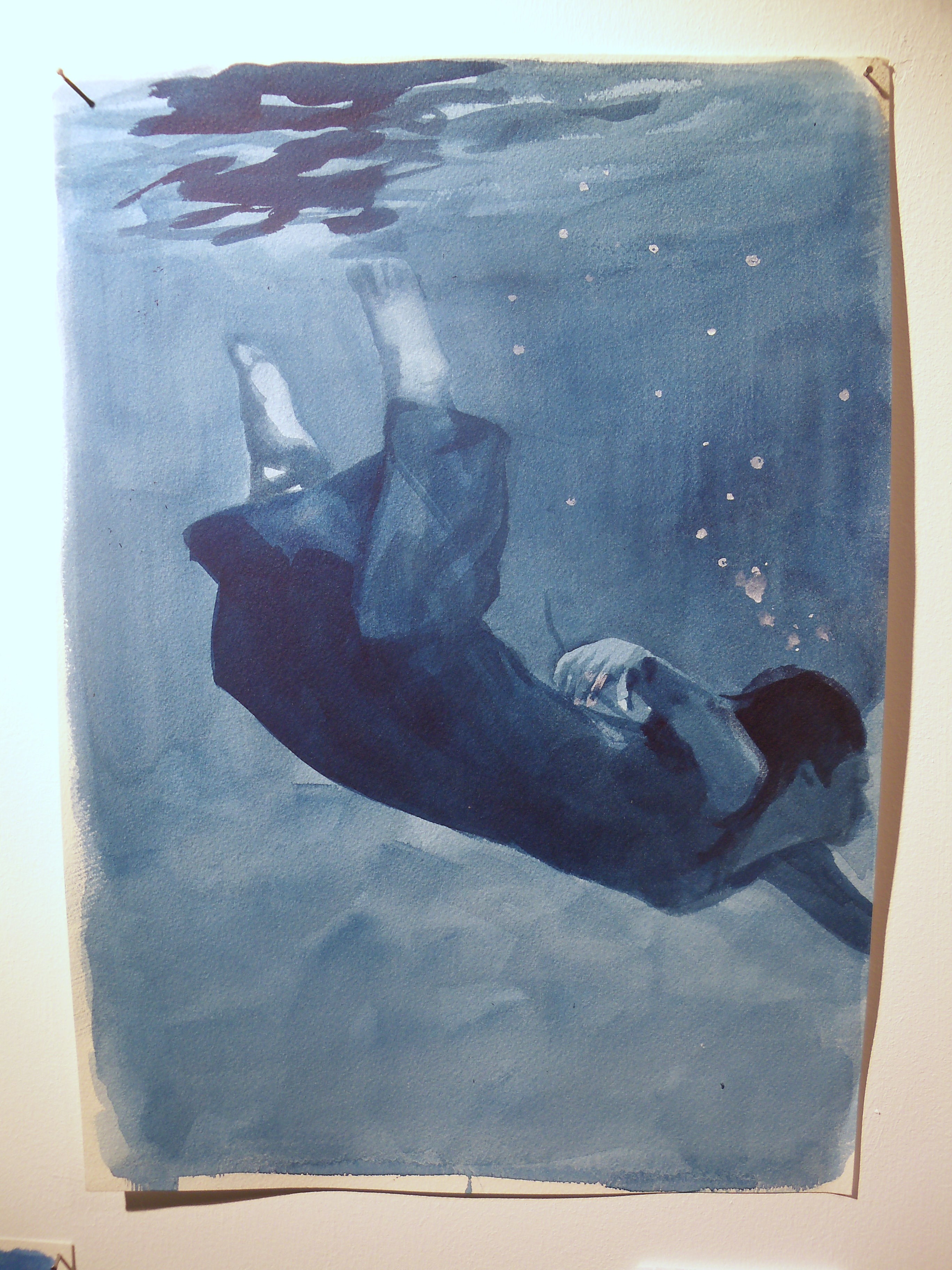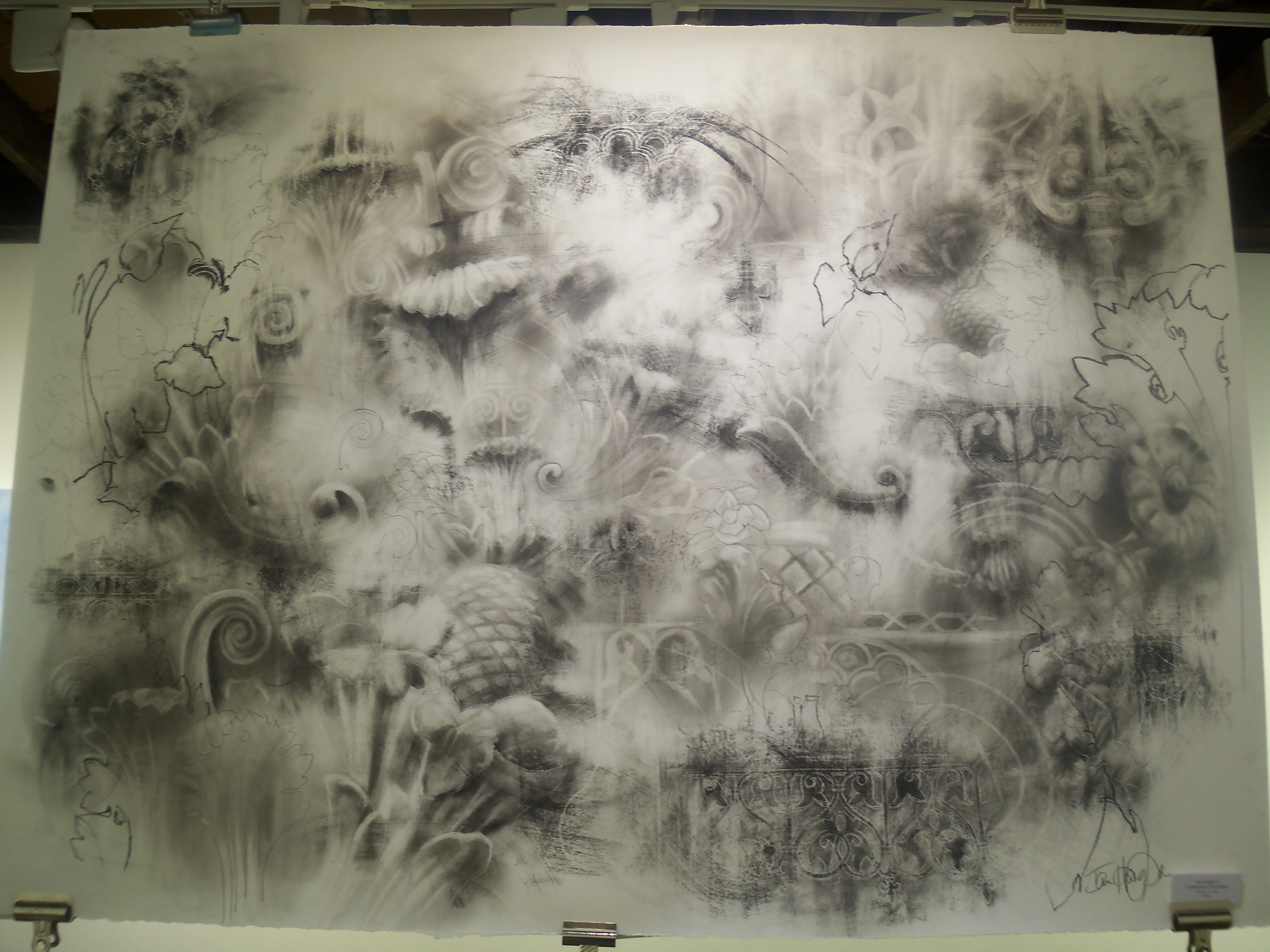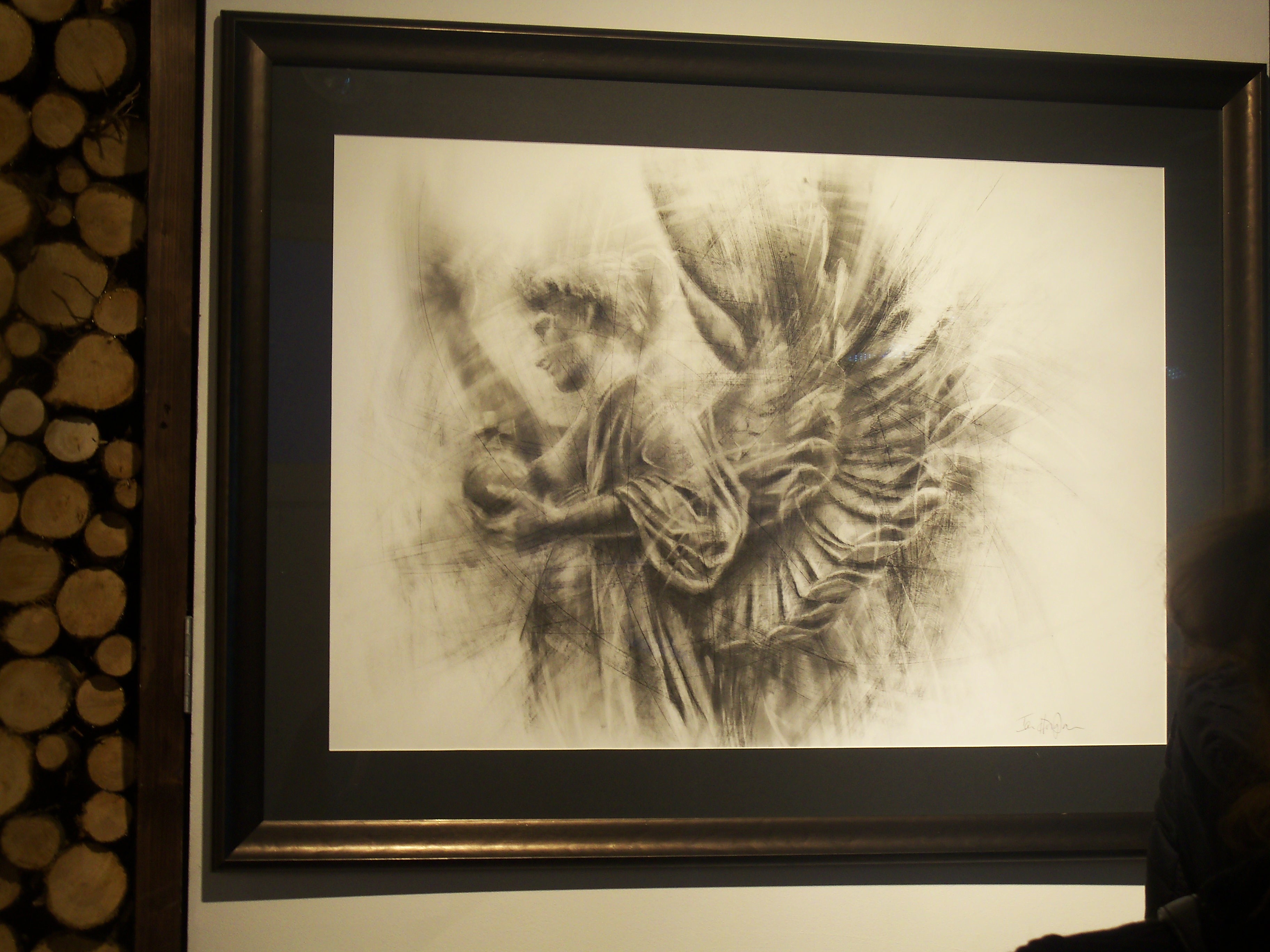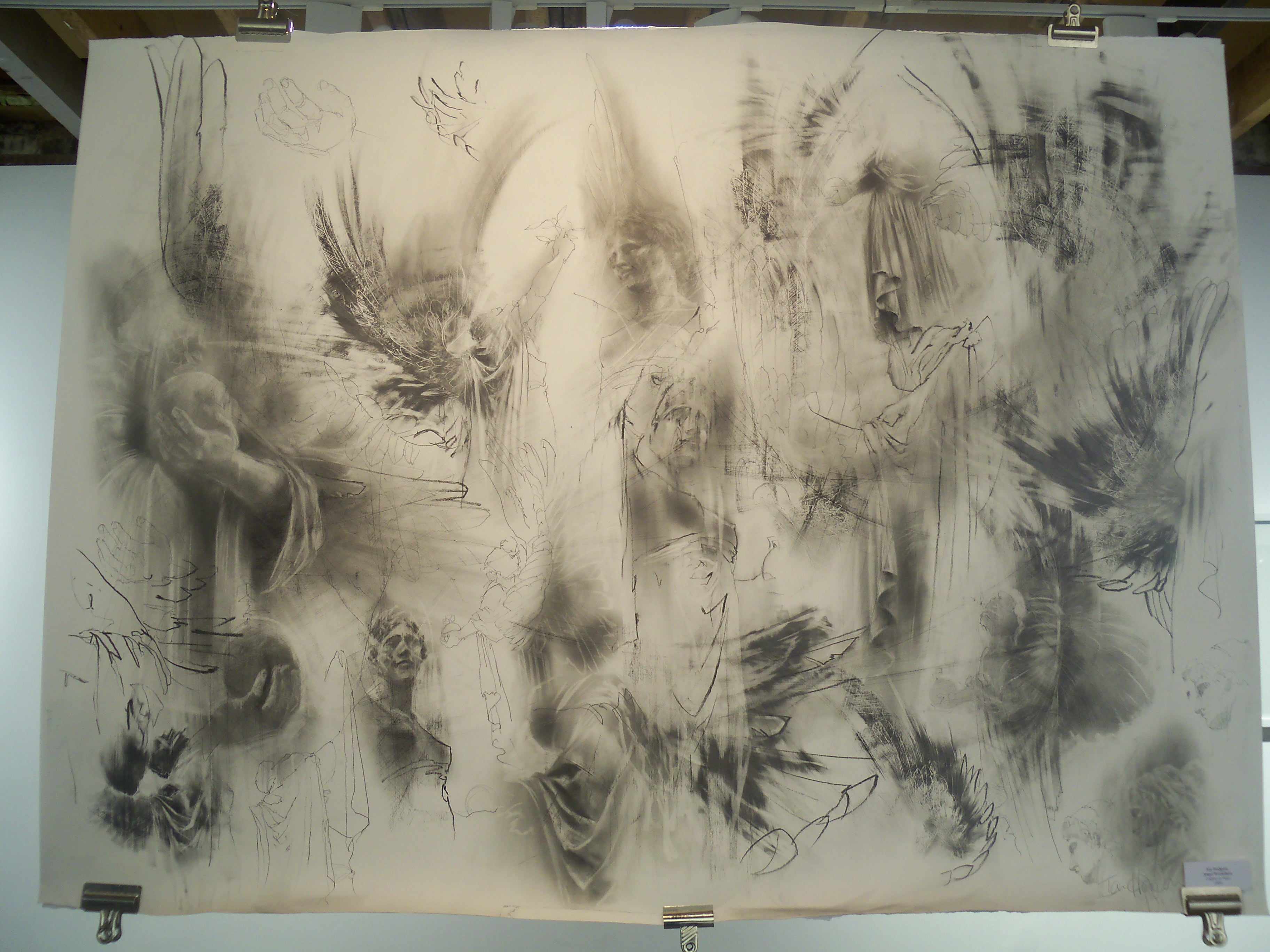 Naked Eye’s airy white showroom was the perfect place for these works. The visitor is greeted by a huge river-green and scarlet composition of a figure floating in water, alongside large charcoal drawings (Patsy McArthur); expressive works in graphite including the iconic drawing of the Brighton Peace statue that graced the cover of this year’s Brighton Artists directory (Ian Hodgson), and atmospheric expressionist-abstract landscapes (Lesley Jones).