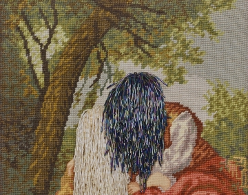 Combining reworked and subverted domestic textile kits, Matt has stitched patterns drawn from Scandinavian knit, Berlin wool work and Op Art, ‘Trouble with History’ refers to both fine art and craft, while refusing to settle completely into either category. The ambiguity that ensues, as well as the subversion of the intended original image, allows for multiple viewpoints and readings into the works.