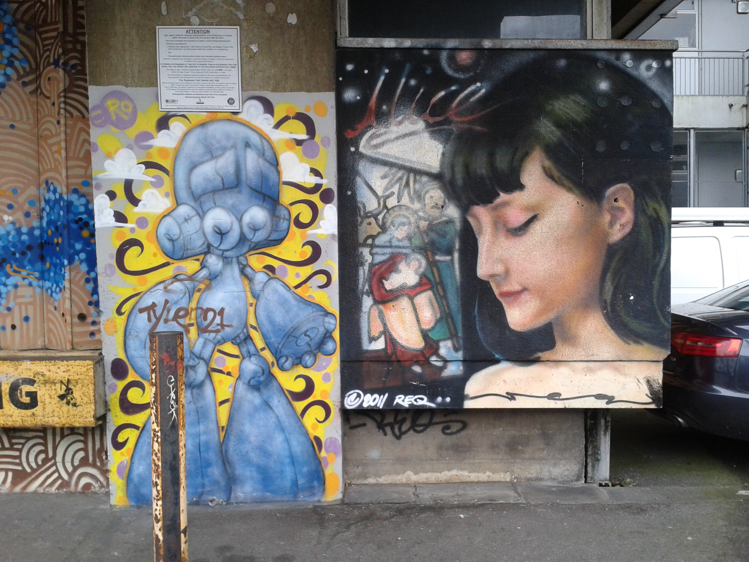1 October 2015 Not exactly new, as it’s dated 2011, but I only just got round to making a photo. Two pieces of spray-can art by local heavies Sinna One (robo-alien figure on the left) and Req (fine art style face-of-the-anima on the right). These are to be found on the ground level on the east-facing side of New England House.