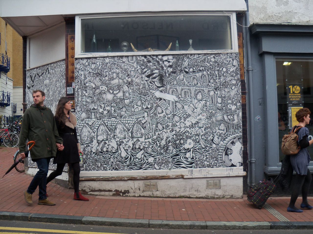 1 Oct 2015. OK, this post is a year late! I took the photo in this liminal time – last year! Street Artist, Stink like Dog, was doing this amazing freehand composition on the “Foundry” on Trafalgar Street near Brighton Station. So I took my high res Canon and took a picture to preserve it. And here it is, a year later, in all its original glory. This drawing is sort of even, tonally, so its worth zooming in to see the amazing detail coming out of Stink’s imagination over the period of several weeks it took him to make the piece. This work is still there, a bit mouldy and sightly defaced.