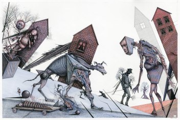 Sometimes Ian made me see the world differently. I couldn’t look at a pylon or a rocking horse or a gnarled tree without being reminded of Ian’s drawings […] He is an excellent artist, which is by the way only marginally a matter of technique. There is nothing of the copyist about Ian Miller. I doubt very much that he uses reference material of any kind. Patrick Woodroffe