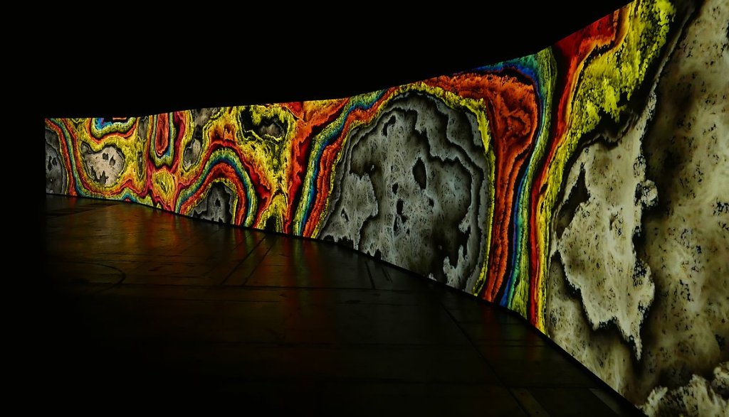 A five-channel computer generated animation, the work creates an immersive experience of the phenomena of landscape formation through the scientific and technological devices that are used to study it. Masses of colourful layers are animated by the soundscapes of earthquake, volcanic, glacial and human activity, recorded as seismic waves, which form spectacular fluctuating marbled waveforms. The 20 metre screen zig-zags through the space taking over the entire gallery .