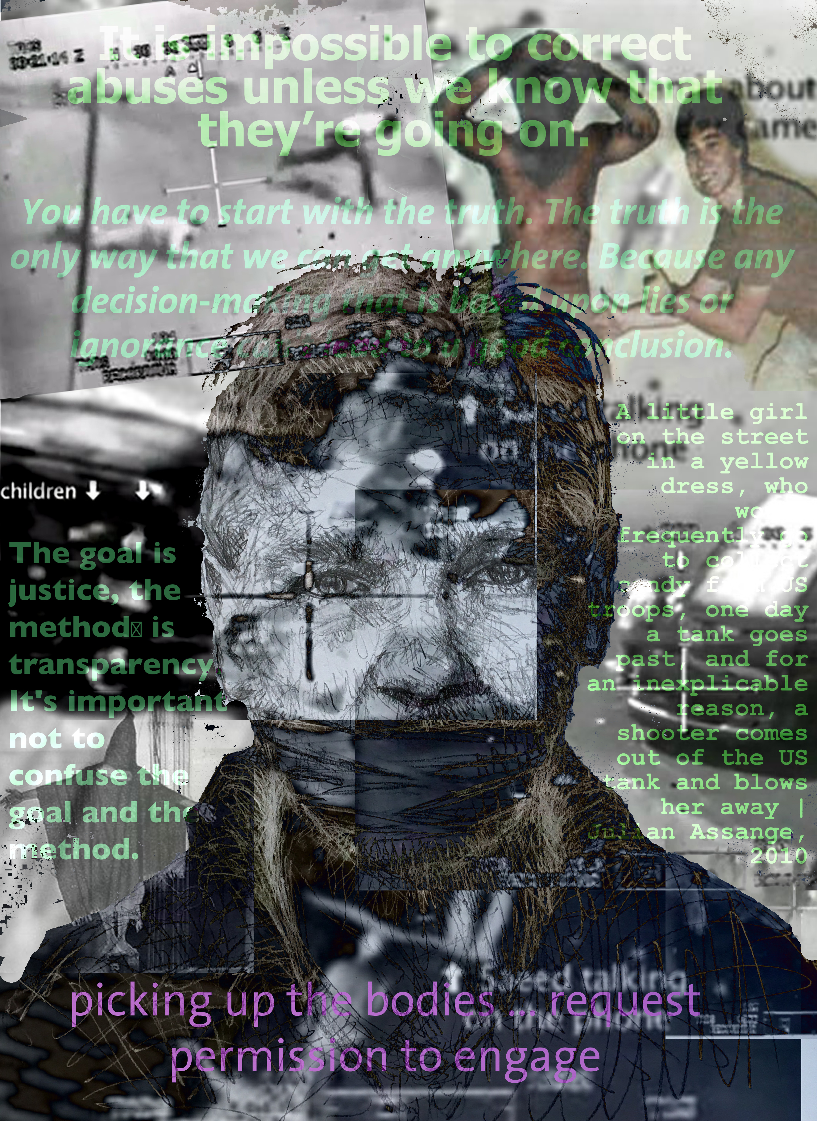 Is the selection of this artwork a sign that the establishment itself is uncomfortable with the media silence about Assange’s continued detention without trial? Or is this a case of protest being assimilated by capitalism, and rendered harmless by commercialisation? Is the establishment containing protest by incorporating it into the dominant culture, so long as it does not threaten the established order. “Look, we are a democracy, see, here is protest art.” The elite can rest happy that censorship does not exist in our culture – so long as dissent remains in the cultured classes, and does not reach the masses through the mainstream press. But maybe it’s worse than that. Maybe the establishment wants us to see that they can do anything. Effectively they can torture with impunity, so that we all fear the consequences of dissent, of speaking out.