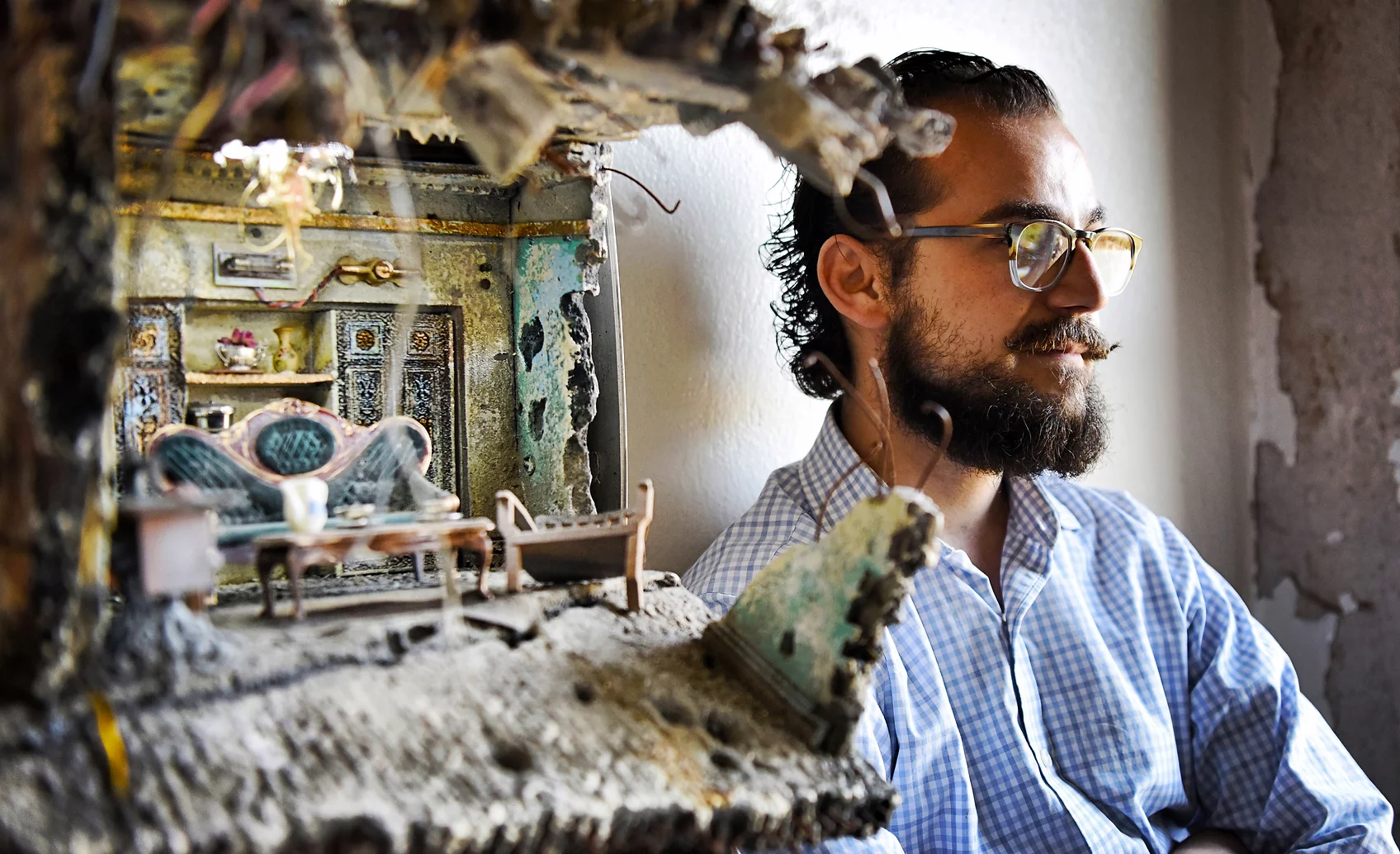 Mohamad Hafez describes the initial motivation for his work as being a deep homesickness. Having gone to the USA from Syria in 2003 on a single-entry visa to study architecture, he realised that he couldn’t return to his home country. As a way to address his longing for home he decided to conjure it through his art by drawing on the memories and sketches he had made whilst he was there to recreate in tiny but tangible form, the architecture and street scenes of his home city of Damascus.