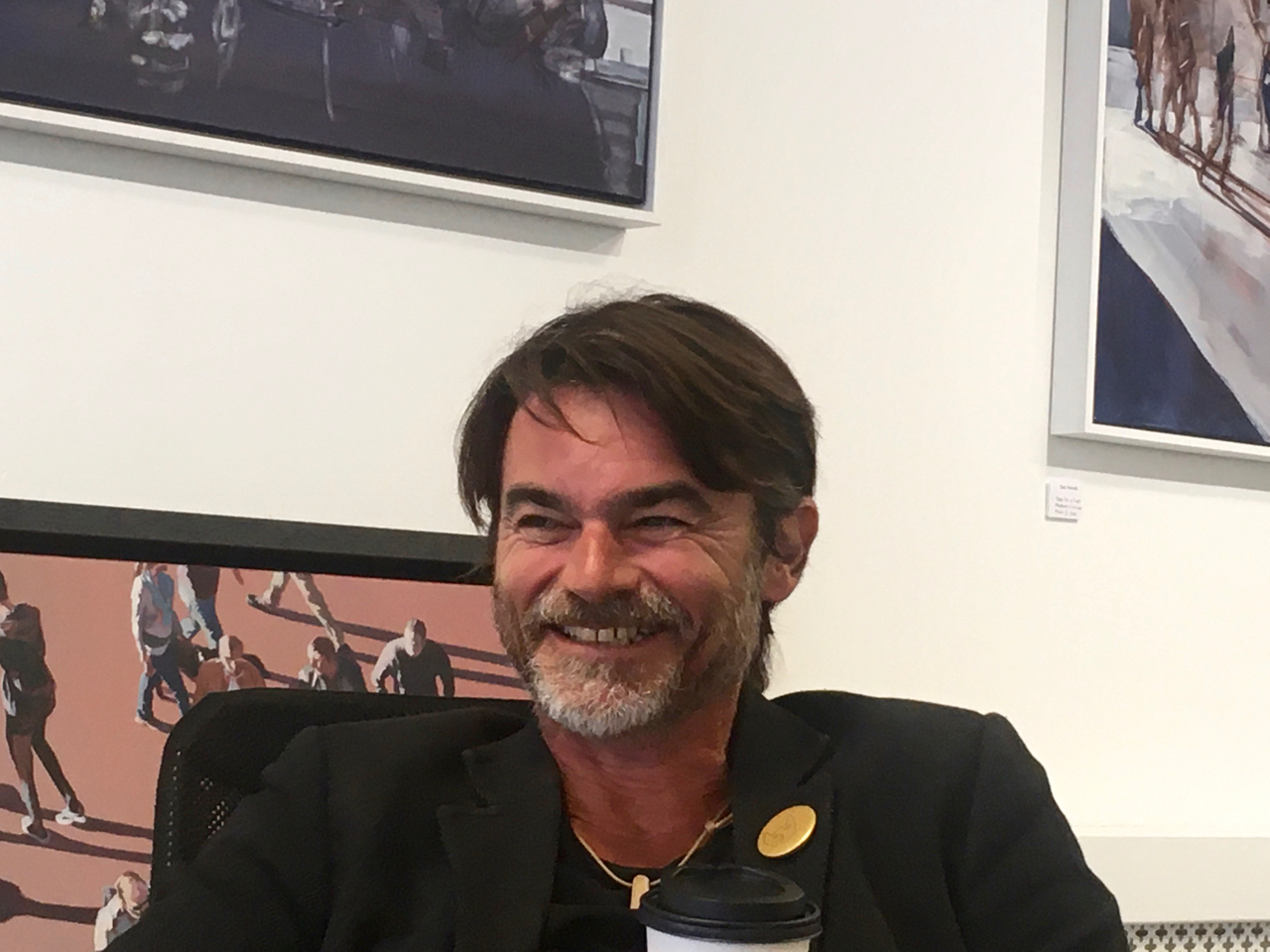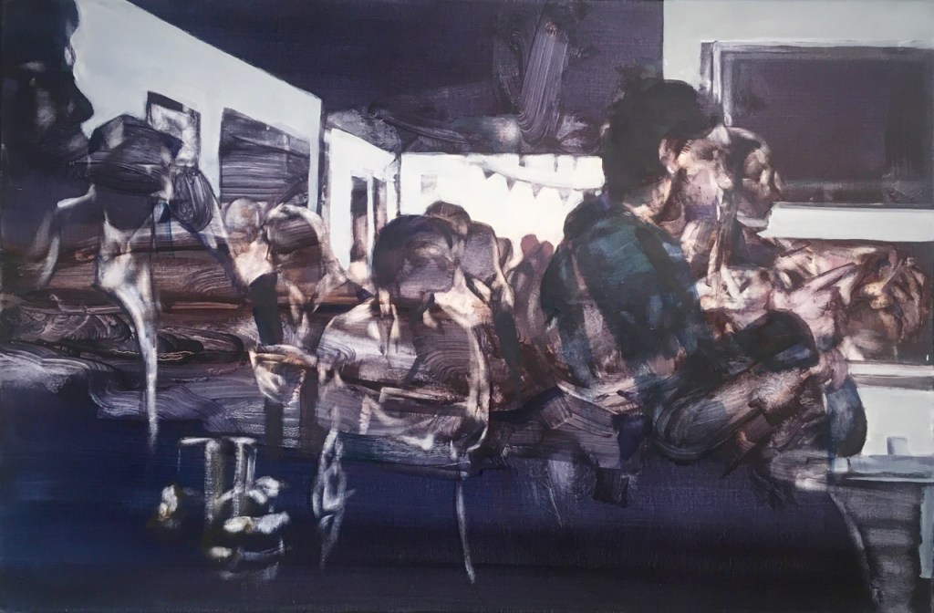 I feel familiar with Sam’s paintings of groups of people viewed from above, such as “Between the Bars” (left): small figures move through public spaces, on their way to somewhere else. The colours are warm, purples and oranges, but the figures seem disconnected from the smooth, colour field, and disconnected from each other, as they make their way through the bright, empty space, casting shadows taller than themselves.