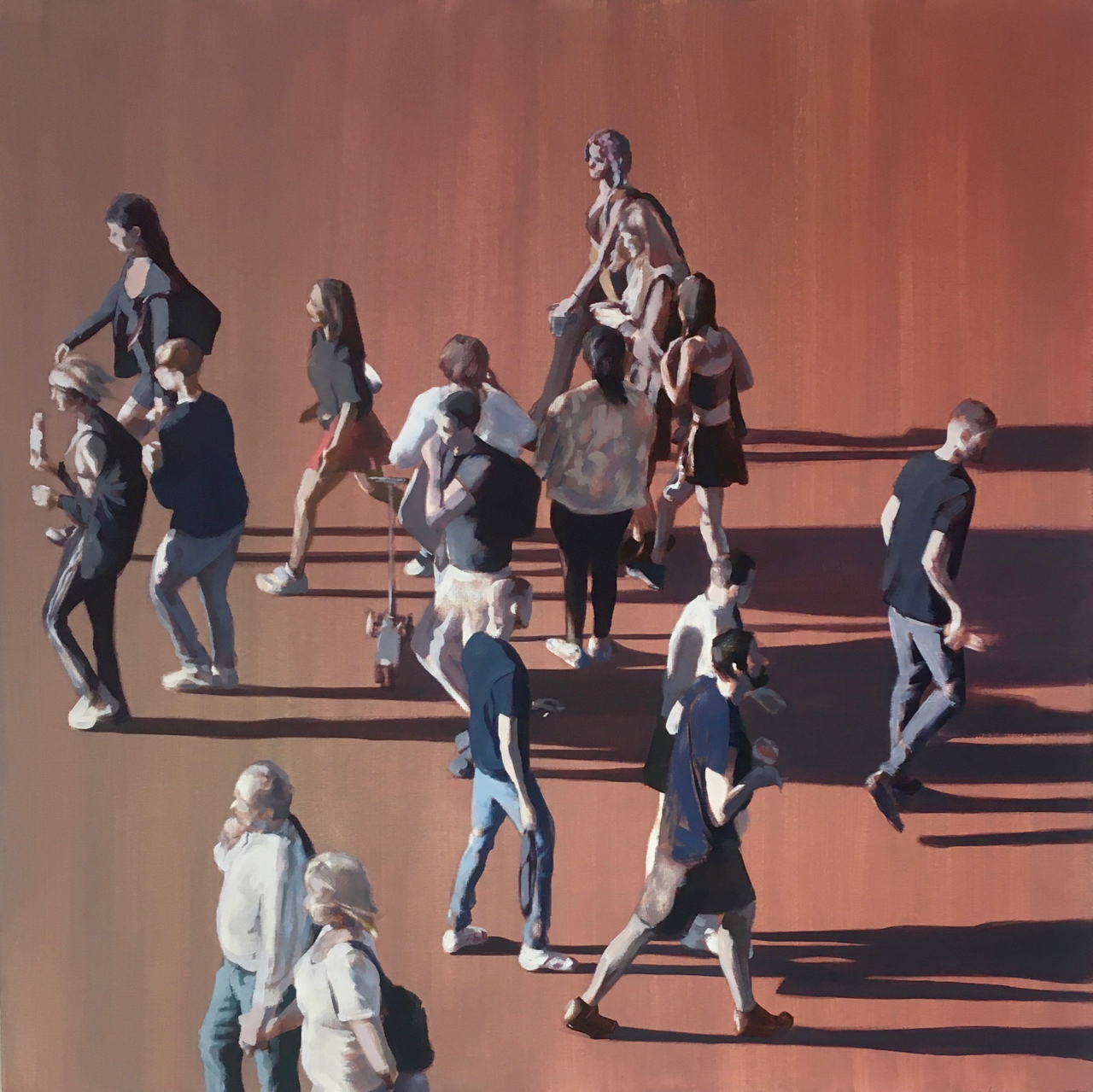 The figures form a crowd, a group of disconnected individuals each going their own way. Until we look closer, and we see they all relate to each other somehow. Some hold hands. One tall, one short. One is fashionable, one dowdy. One is caught in a moment of clumsiness, another looks on. One even catches the eye of the audience – the onlooker, the viewer of the art, the voyeur – and nods in greeting.